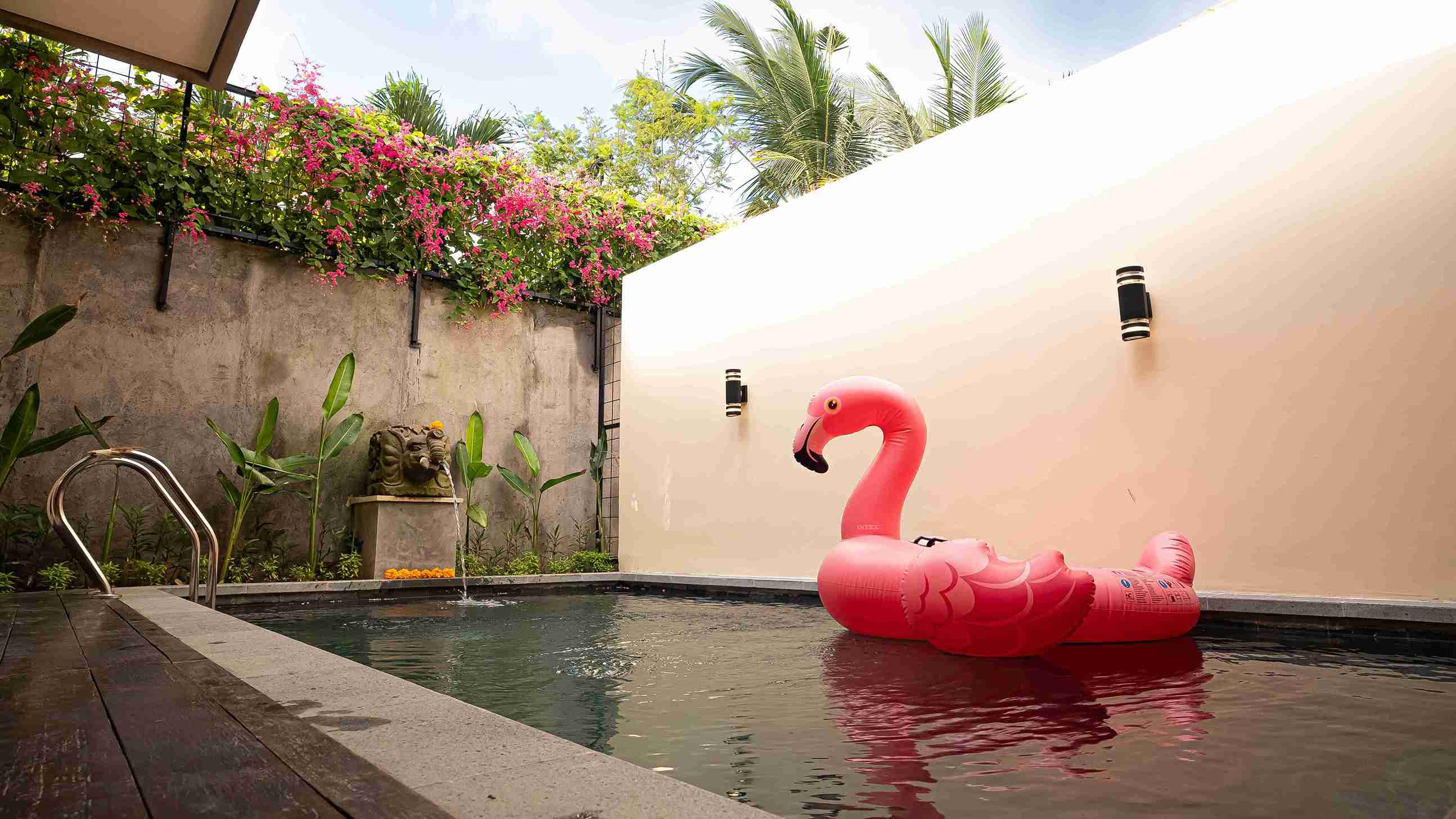 The highlight of the property is the private swimming pool, set in a beautifully landscaped garden—ideal for cooling off or lounging in the tropical sun.